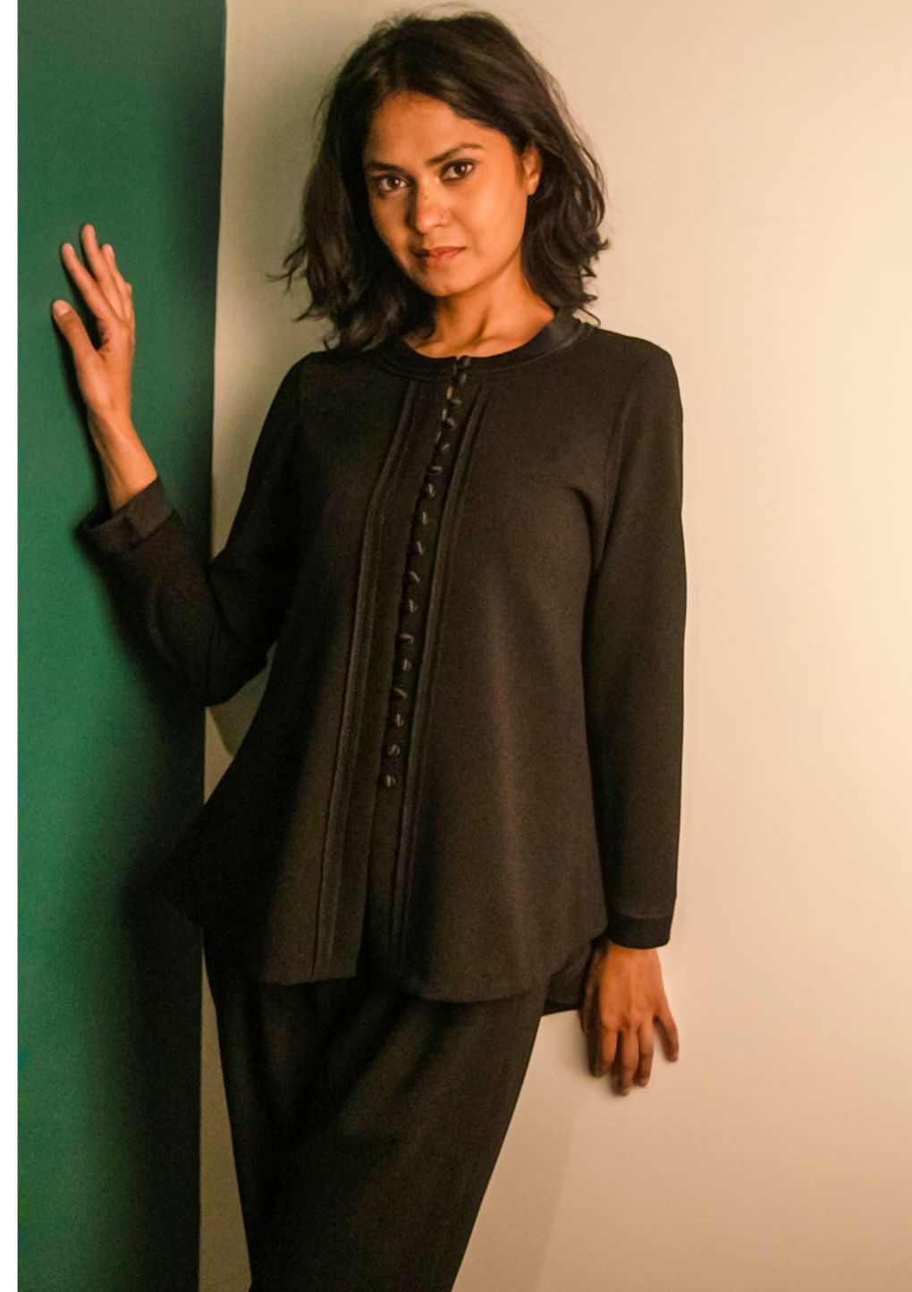 A beautifully structured outfit which will take you from day to evening. The unlined jacket style top swings from the back to add movement and style. The narrow cut trousers complements the short jacket.