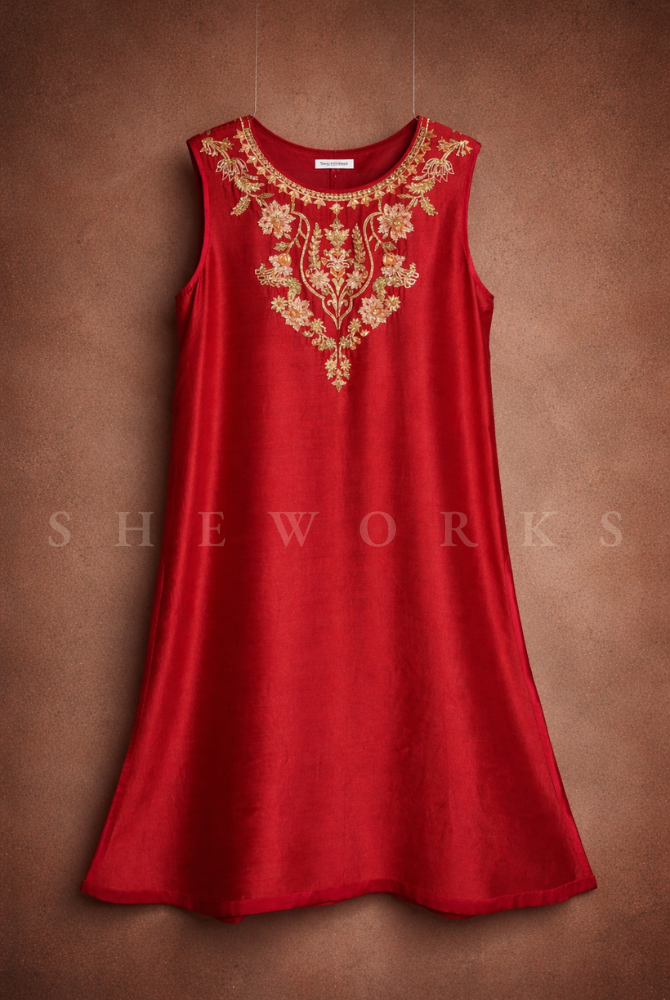 This elegant crimson Roman silk shirt features delicate embroidery with intricate dabka and sequin work on the neckline. The rich color and fine craftsmanship create a graceful and luxurious look, making it a perfect piece to help you stand out at any event. Designed with a clean silhouette, it offers both sophistication and comfort for festive and formal occasions.