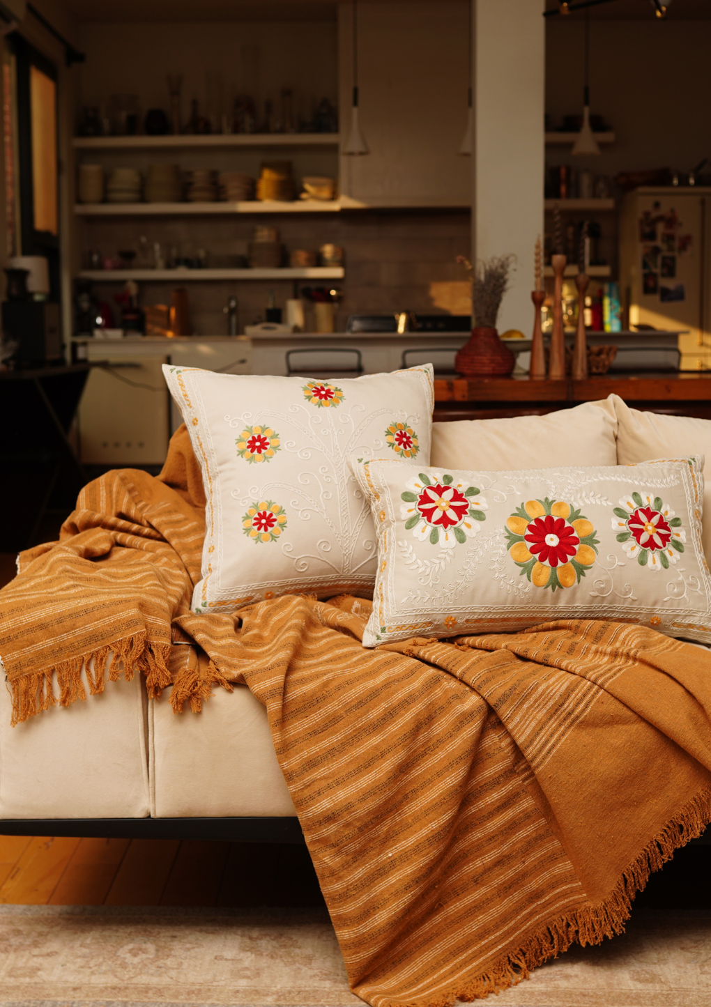 Square and lumber cushions on sturdy cotton. Hand embroidered in the traditional needlework technique by women artisans from South Punjab.