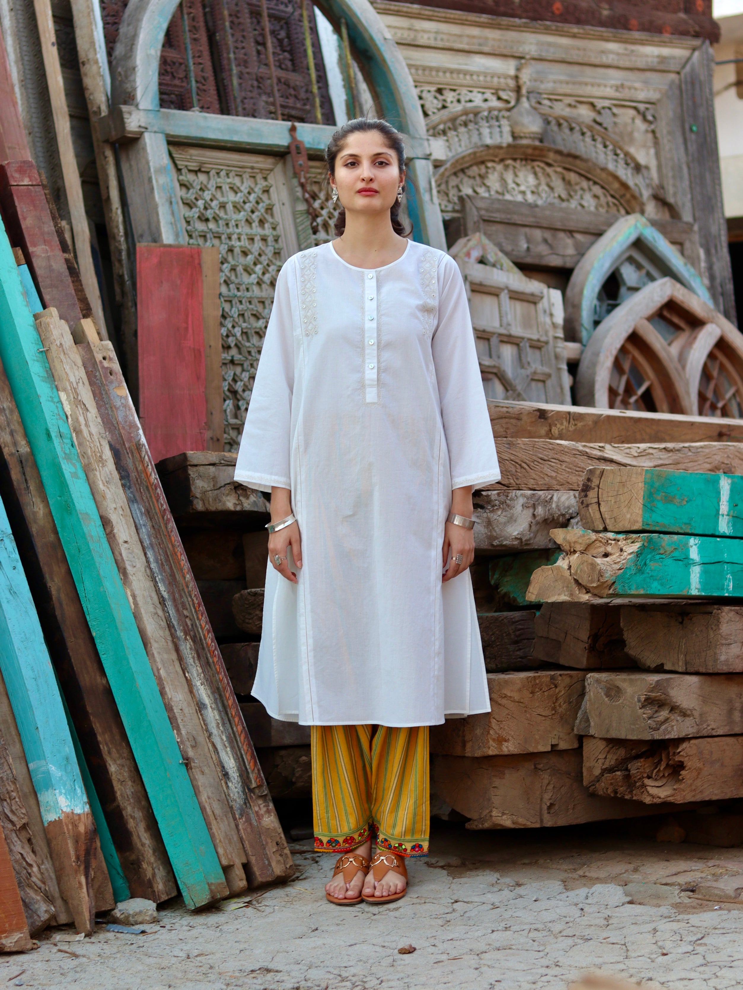 A timeless white voile shirt featuring delicate Sindhi sheeshakari
