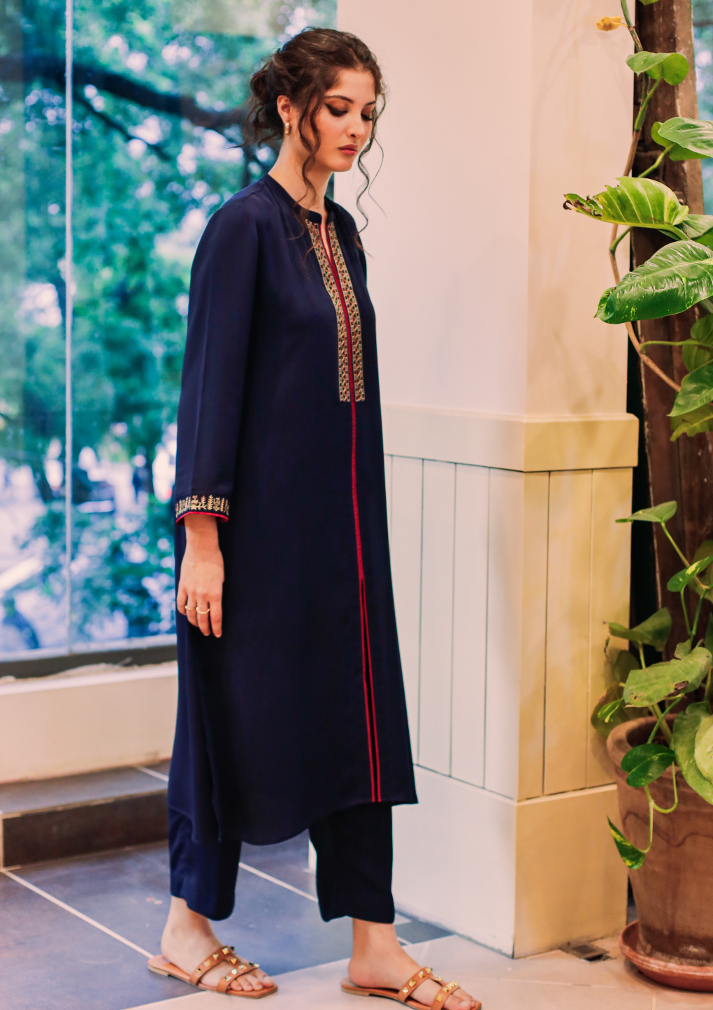 The South Sea shirt is a piece crafted from dark navy blue georgette, featuring exquisite embroidery in silk thread and metallic gold. The edges are finished with a luxurious maroon satin silk.