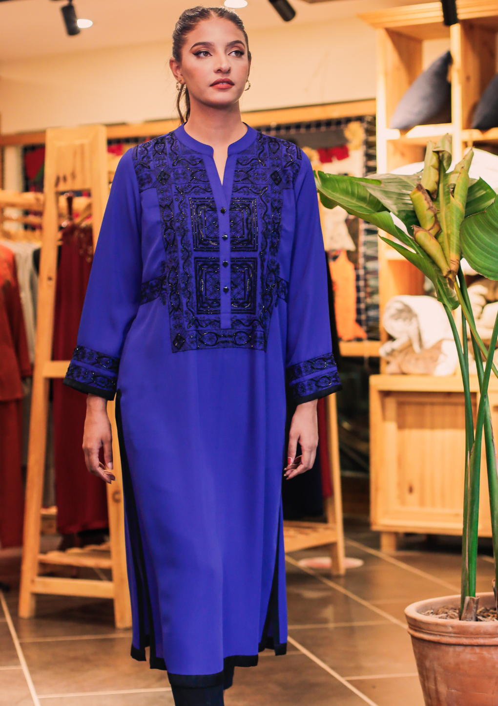 Long georgette shirt with a black silk trim. Embroidered with beads and sequence. Wear it on a holiday lunch party or dress it up for a formal dinner.