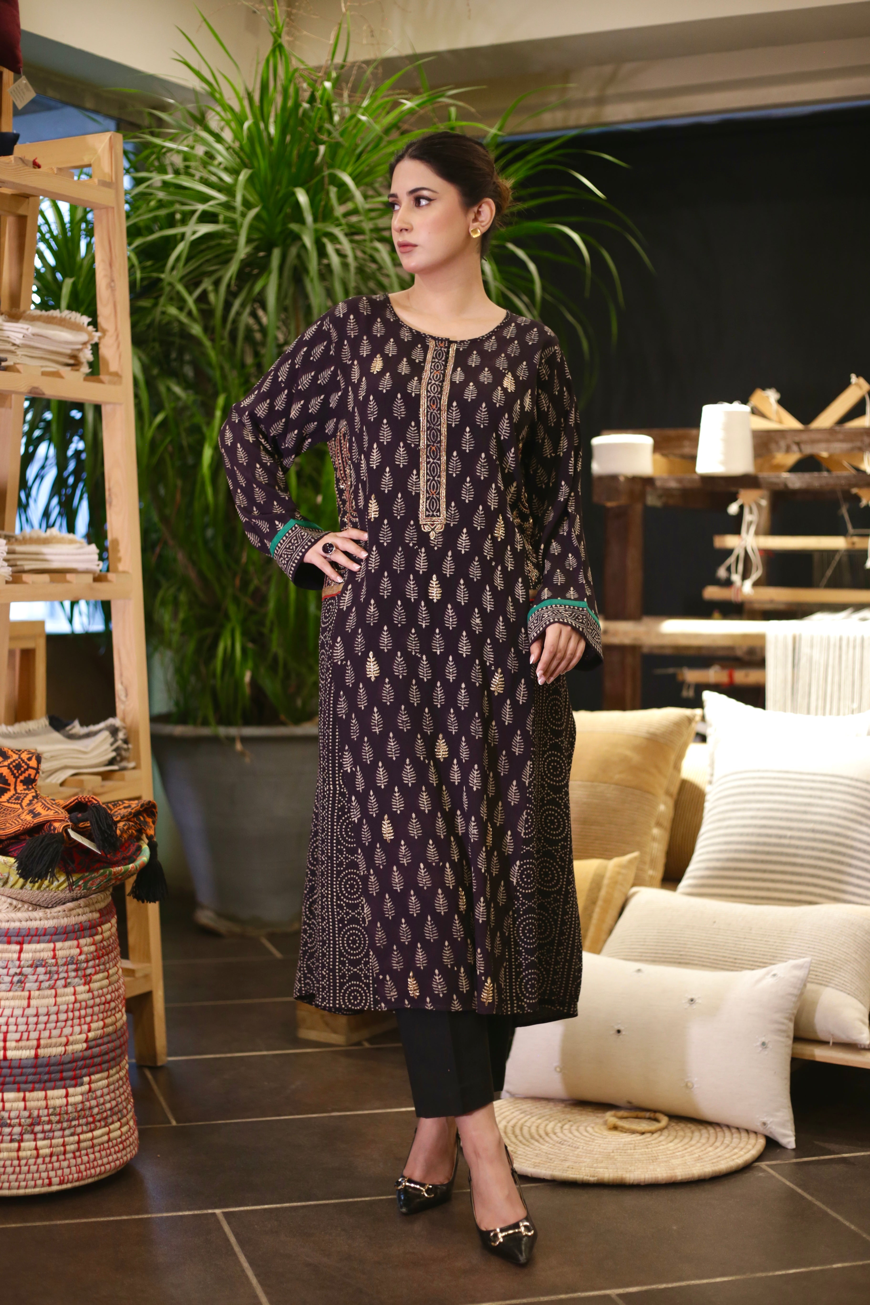This timeless hand-blocked and dye-printed Ajrak shirt beautifully merges heritage craft with luxury detailing. The rich base is adorned with traditional Ajrak motifs in earthy tones, and the pattern is enhanced using pitta ,raishm and dabka. adding the depth and opulence, creating a striking contrast against the deep hues of the print.